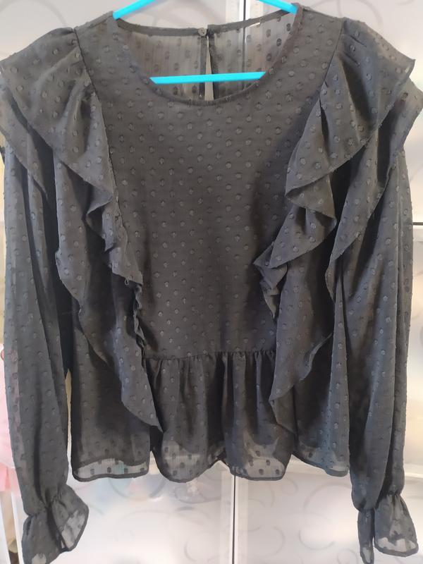 В хорошем состоянии, с рюшками, свободного кроя, плечи 40 см, ширина 50 см, длина 56 см, длина рукава 60 см.