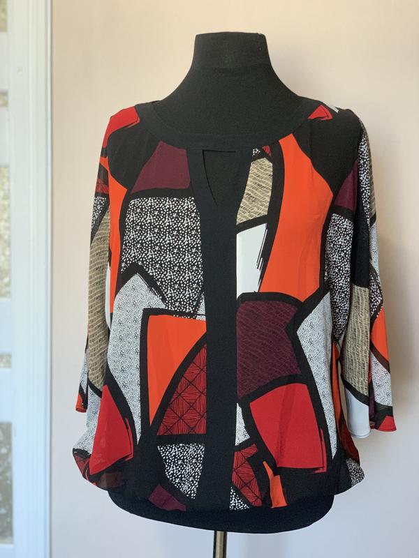Шифоновая яркая блуза,шифон качественный,гарный принт и фасон (низ блузки на резинке),оригинальный рукав, большой размер, замеры надеваю ОГ и ОБ-130 длина-70