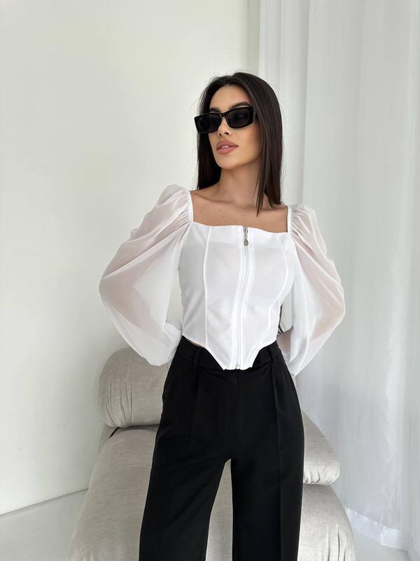 Кофточка #кофтатрендшоп Код товару: 17231 Ткань: креп-дайвинг + шифон Размеры: 42-44, 46-48 Цвета: белый, черный Замеры: 42-44 Объем груди: 80-90 см 46-48 Объем груди: 88-98 см Длина по переду изделия: 34 см Длина рукава: 62 см *фото реал
