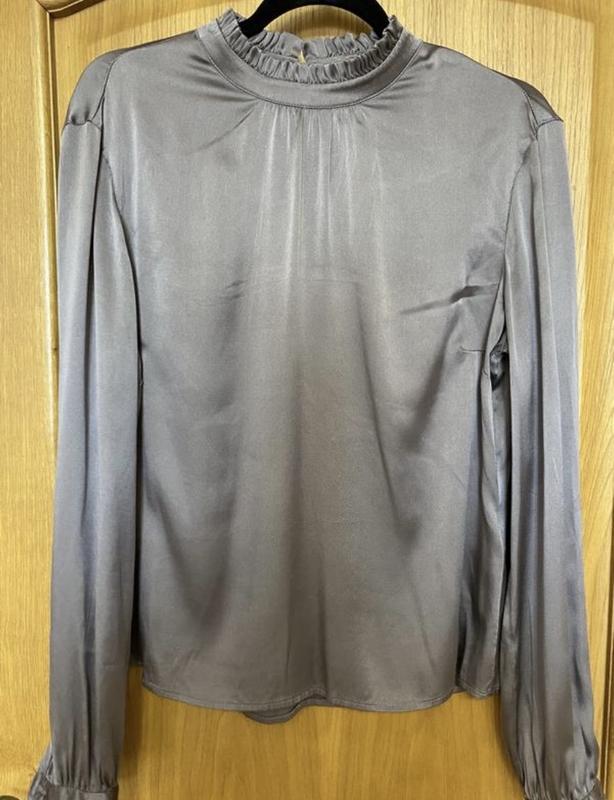 Тонкая, универсальная блуза с длинным рукавом, с горлом. Очень красивый оттенок - серый с отливом. Есть крошечная зацепка. Длина 60,61. Рукав 64. Плечи 43. Пройма 23,5. ПОГ 57. Пот 52. Поб 54