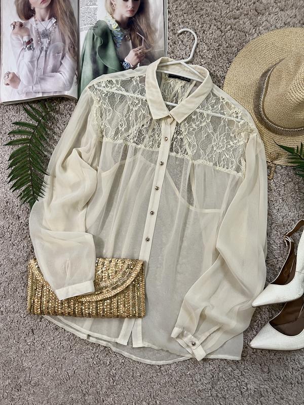 Для більш точного визначення, виміри, порівнюйте із вимірами подібної речі, а не зі своїми обсягами. Неординарна шифонова блуза сорочка з мереживом. Тканина тонка, просвічує, не тягнеться. Вставки з мережива. Кремовий відтінок. Застібається на золотисті ґудзики. Позаду оригінальний крій. Стан: дуже хороший. Дефекти: ні. Розмір на бирці: 20. {Виміри виробу вимірюються у напівобхваті, а не від шва до шва!} Виміри виробу: Плечі 53см. Рукав 59см., Висота пройми 39см., Ширина рукава 25см., напівобхват грудей 53см., напівобхват талії 66см., напівобхват низ 66см., довжина по спині 72см. довжина від плеча 66см. Склад тканини: 100% поліестер. Країна виробник: -. Бренд: Atmosphere. Оплата і доставка: Оплата на картку монобанк. Бронювання на оплату тільки 24 г. При змінах наміру купувати обов'язково повідомляйте! Доставка: На час введення воєнного стану, уточнюйте, чи можлива доставка до Вашого пункту. Актуальні новини можна уточнити на сайті перевізника та за номером телефону контакт-центрів. Не забудьте ПІДПИСАТИСЯ, щоб бути в курсі всіх новинок та розпродажів!
