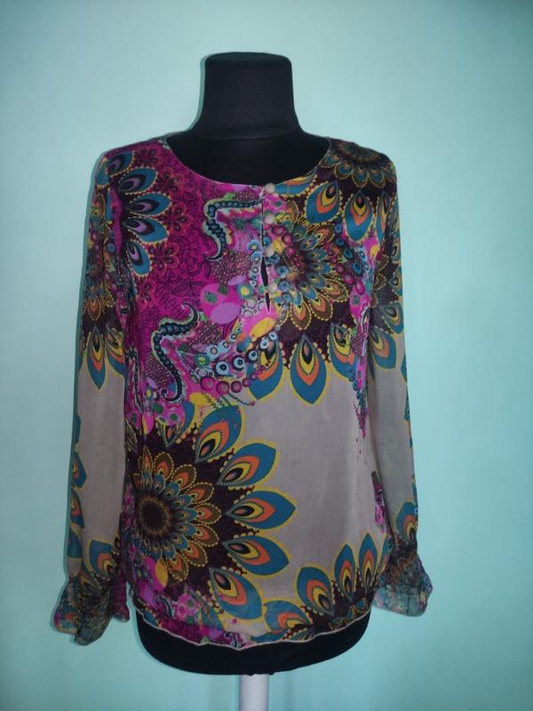 Оригінальна блуза Desigual. Довжина по спинці-72, Пог-51, Пот-53, довжина рукава-65. По низу виробу та низу рукава-резинки.