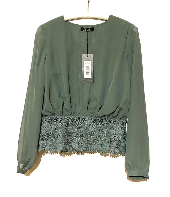 Красивая новая с биркой короткая зеленая блузка-топ Axel, блуза с длинным рукавом. Размер: S / EUR 36 / наш 42. Не просвечивает. Неглубокий мысок. Однотонна, без принту. По низу красивое широкое кружево. Спереди и сзади идет двойная ткань. На рукавах тканина в один шар. Полиэстер, ткань не тянется. Молния по боку. --- Длина 56 см, грудь ПО 47 см, не тянется, низ ПО 42 см, плечи 37 см, рукава 60 см. --- Без дефектов и нюансов. --- Безпечна оплата, Meest, Новая почта, Украшта, личная встреча в Киеве, налавка с подпиской за услуги почты. Возвращение принимаю в течение 2 дней (послуги почты за счет покупателя).