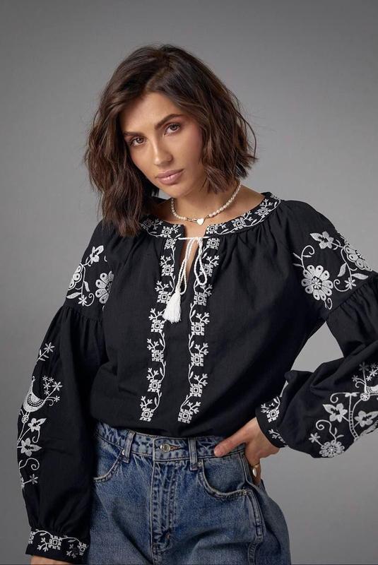Жіноча чорна блуза-вишиванка з білою вишивкою та пишним довгим...