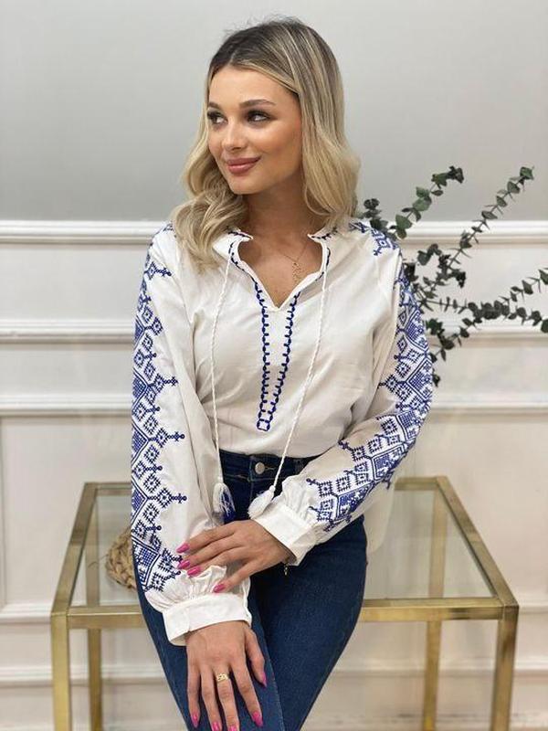 Жіноча ошатна біла блуза-вишиванка з довгим пишним рукавом