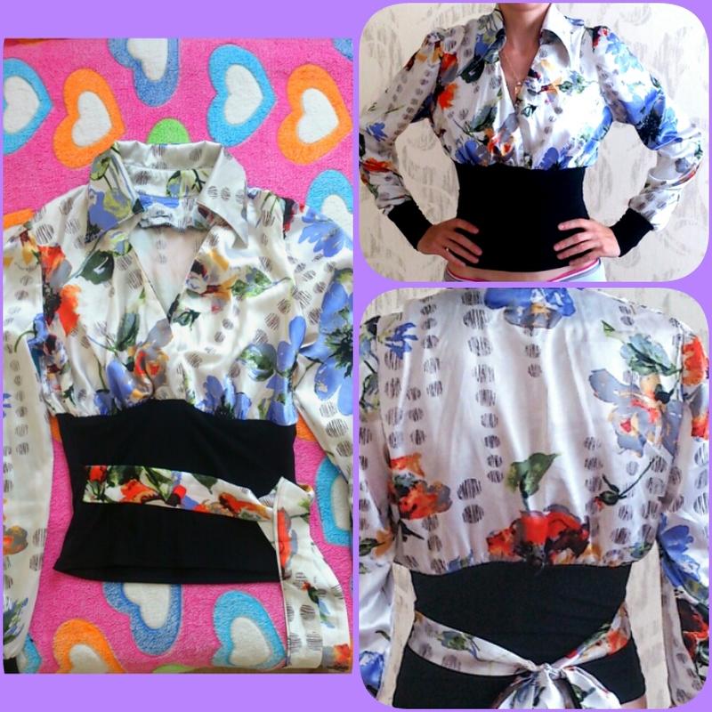 Блузочка в размере С-М, верх - атлас, низ - вискоза/эластан. Ширина в плечах 37 см, длина рукава 65 см, длина блузочки по спинке 50 см.