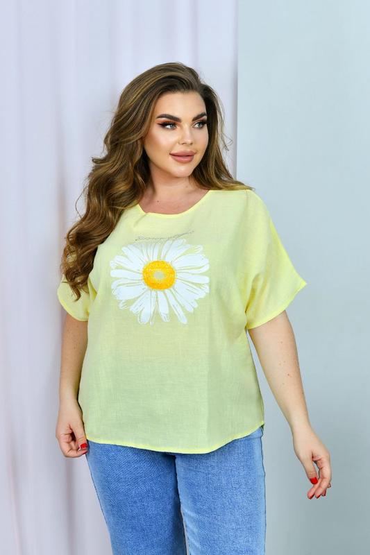 Блузка Модель 1265 Ромашка + стразы Ткань лён Не тянется.легкая Цвет голубой.желтый Размер 50-52 54-56 Полномерные