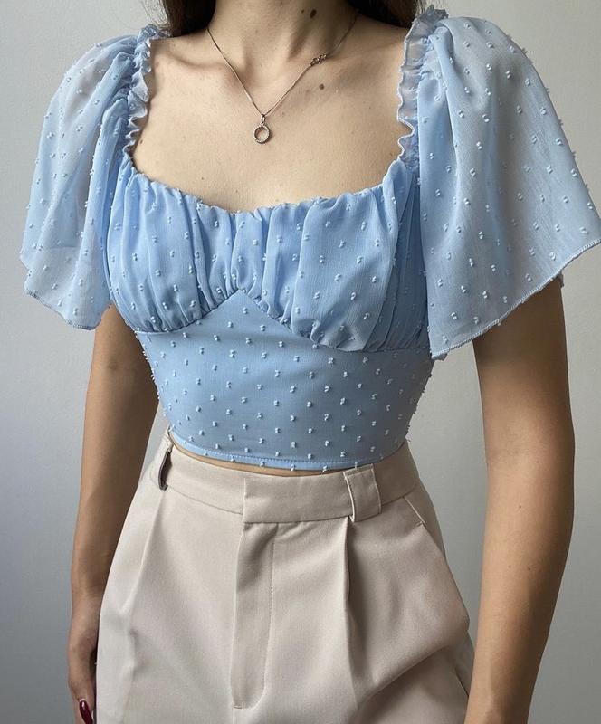Нежно голубой топ, очень легкий, можно носить как с закрытыми плечами, так и открытыми. Размер М