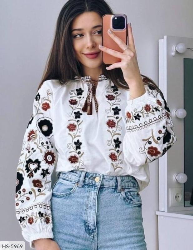 Блуза HS-5969 модель 5282 Розмiри: S, M, L Замір: S Пог -53 Довжина -61 Довжина рукава від горловини-66 М Пог -55 Довжина -61 Довжина рукава від горловини-67 L Пог -57 Довжина-62 Довжина рукава від горловини-69 Стильна сучасна сучасна вишиванка Склад тканини: 80% бавовна, 20% поліестер. Вишивка машинна гладь Країна виробник: Туреччина Ідеальна сучасна вишиванка, must have в гардеробі Українки. Кольори: білий з бездоганною вишивкою