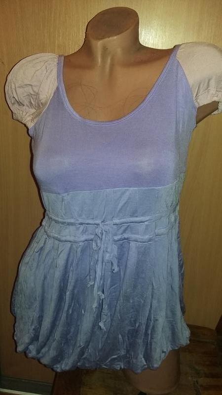 Романтичная блузка известного бренда "Savage" Ткань мягкая,хорошо тянется, ниже лифа двойная. Цвет переходит от мягкого лилового к голубоватому, рукавчики бледно-розовые Смотрится очень красиво и необычно. Замеры размер 44: длина - 58, ПОГ - 43, ПОТ - 36. отлично тянется. Размер 46: длина - 60, ПОГ - 47, ПОТ - 42см.