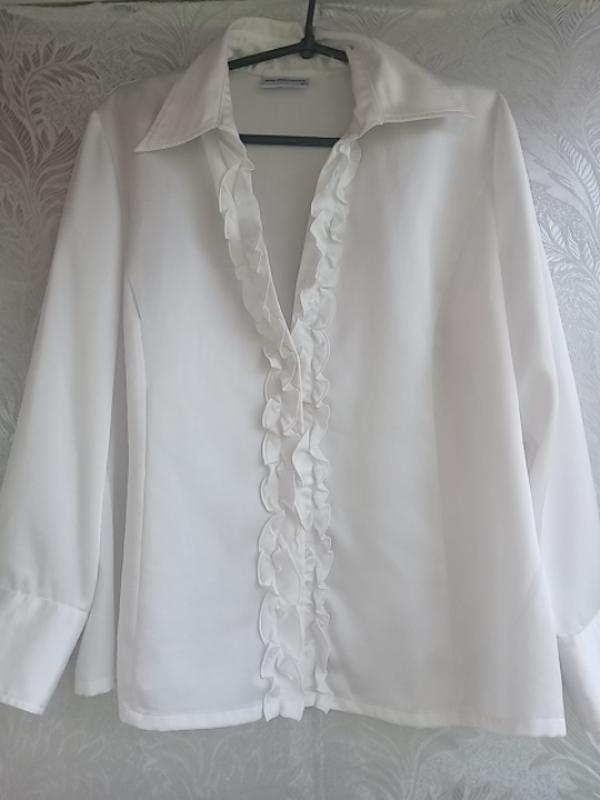 Белая блуза с рюшами по застежке и манжетам. р.М.плечиплечи 41.грудь..54.талия 50.низ 55.