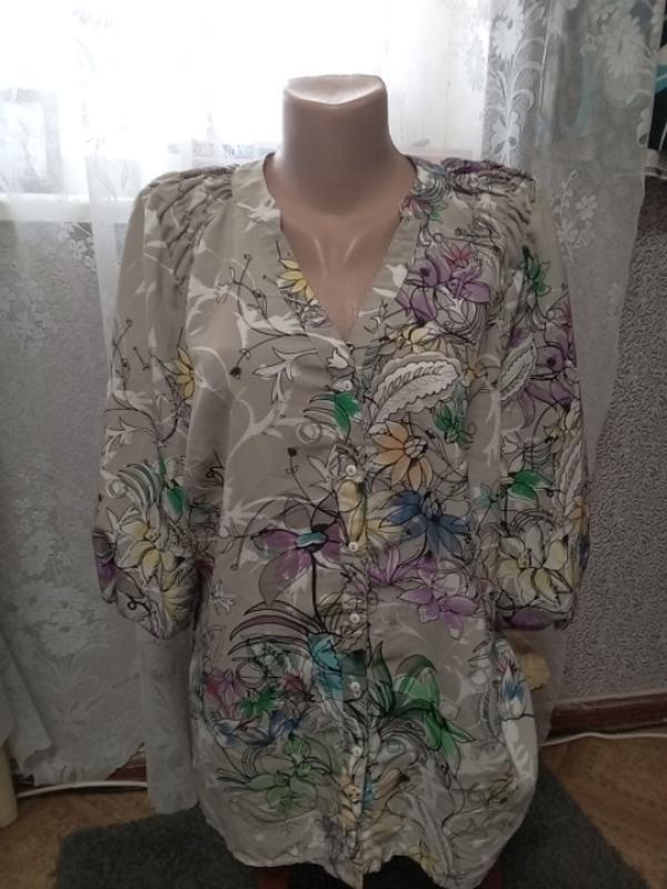 состояние идеальный, красивый цветочный принт на бежевом фоне,оригинальные плечики, очаровывающая вещь, красиво прячет недостатки пог 56 см поб 58 см рукав на резьбовые 44 см плечи 38 см длина 70 см