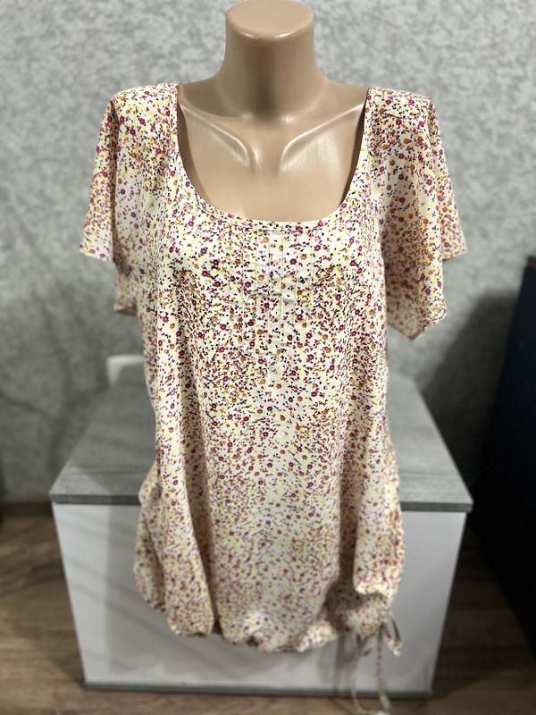 Блуза с коротким рукавом, не прозрачная, не тянется, на завязках, 100% полиэстер. Длина 77см, ПОГ 50см, ПОС 60см, длина рукава от горловины 25см, полуобхват бицепса 33см.