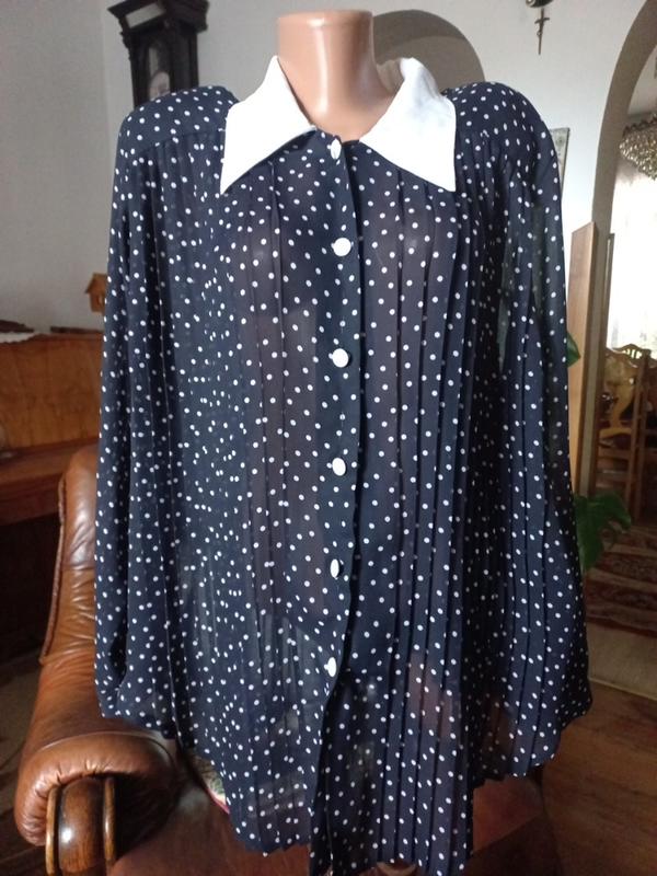 В очень хорошем состоянии, размер не указан, шифон плиссе, очень красив.. Ориентируйтесь по замерам: плечи 44 см, в груди идет и до 140 см, но лучше брать на 125- 130 см, будет более свободным. К низу очень свободно, идет плиссе, перед и зад удлиненные. 76 см.Воспользованным на все вопросы.
