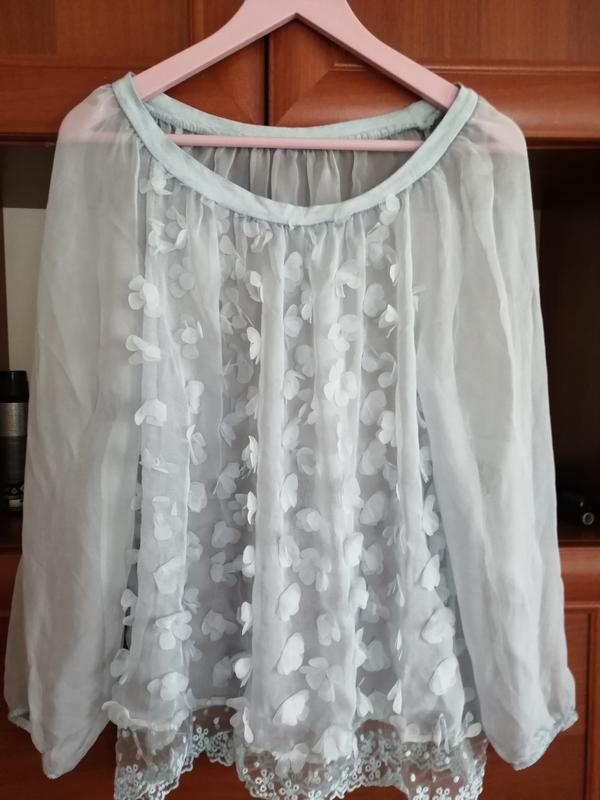 Трендова блуза. Цветы, аппликация, кружево. Состояние очень красивое. Цвет нежно голубой. Идет оверсайз, так что S, М, L. Страна производитель Италия.