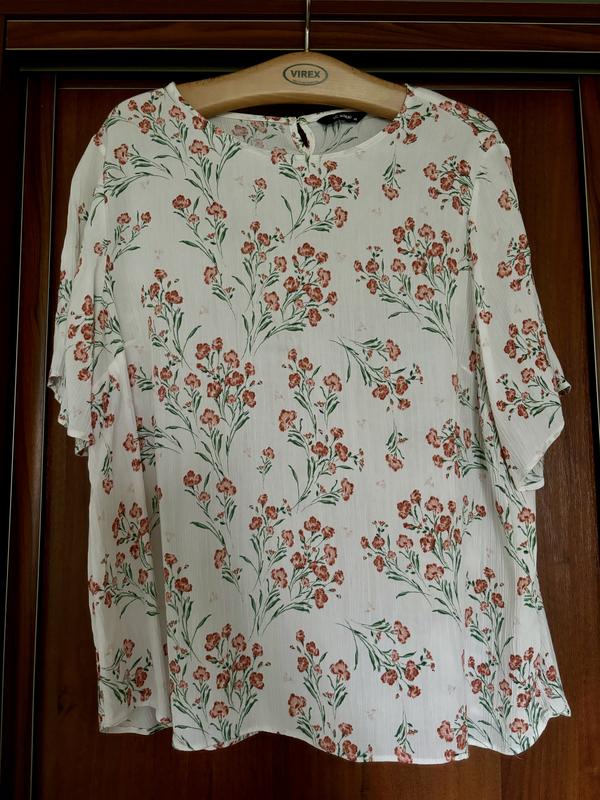 Блуза белого цвета и цветной принт Выглядит нежно романтично Размер 48 Длина 71 Полуобхват груди 60 (в спокойном состоянии) Ткань почти не тянется Вещи возврату не подлежат!!!