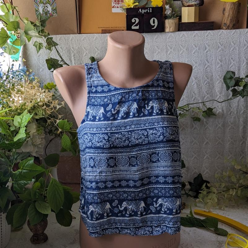 топ блуза бело-синяя со слонами размер с этикеткой с36 но чисто будет визуально на М также под мышкой 42 52 тянется отлично вырос для ручки 24 спокойном низ - стан 52 тянется вплоть до 61