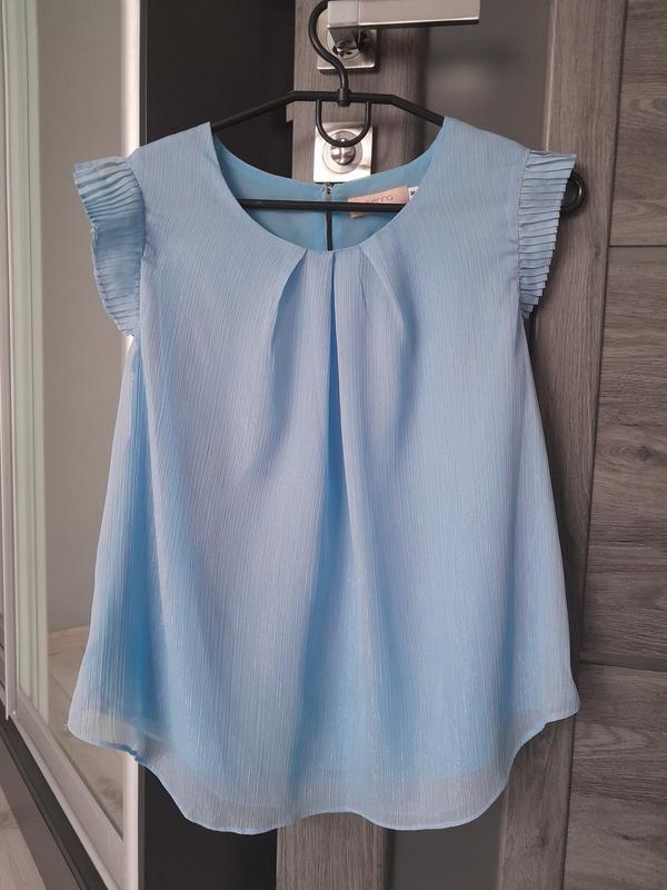 нежная блузка без рукавов, верхний слой блузки имеет блестящую нить, благодаря которой, ткань мерцает и сверкает на свету, ширина по плечам 33 см, ширина под подмышками 44 см, длина сбоку 47 см, перед и зад удлиненные до 57 см