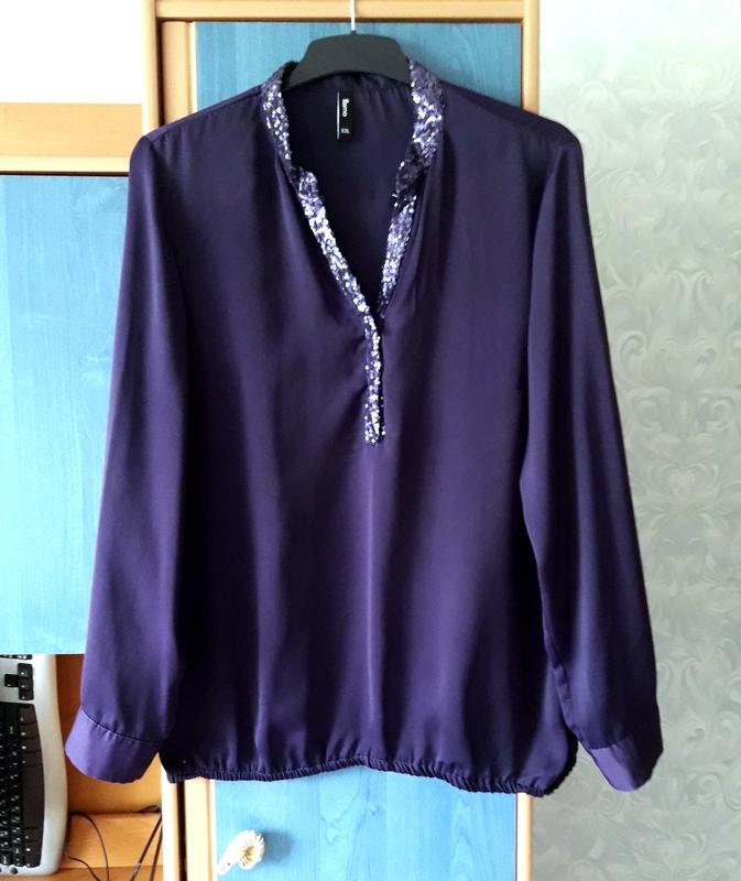 Хочу предложить Вам приобрести нарядную блузу от Flame. Блуза в очень хорошем состоянии. Особую изюминку ей придают блестящие пайетки, которыми обшит ворот и вырез спереди. Материал: плотный шифон. Не просвечивает! Состав: 100% гипоаллергенный полиэстер. По нижней линии блуза на тонкой резинке. Рукава застегаются на 2-х пуговицах. Спереди глубокий вырез, который застегается на двух маленьких кнопках. Указываю несколько размеров поскольку размерные сетки разных брендов отличаются и блуза свободного кроя, поэтому подойдёт на несколько размеров. Размер: 2XL (евро), наш: 50-52, а для уточнения смотрите замеры: длина от плеча 73см; длина от выреза горловины 52см; длина по спине 73см; длина от подмышки 50см; ширина по плечам 46см; полуобхват по груди 58см;; полуобхват по талии 58см, но материал ложится волнами, поэтому подойдет и на меньше; внизу 48см, тянется до 58см, на тонкой резинке; плечо 13см; длина рукав от плеча 65см; ширина в районе бицепса 23см