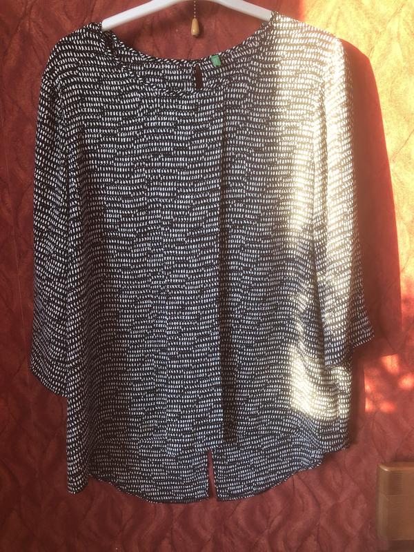 Блуза вільного крою. Спереду по усій довжині складка. Спинка подовжена, по центру переривчасті розрізи. Стан відмінний. Заміри: напів обхват грудей 54см, плечі 41см, рукав від плеча (3/4) 42см, довжина спинки 73, спереду від горловини 56см. Повномірний р. XL.