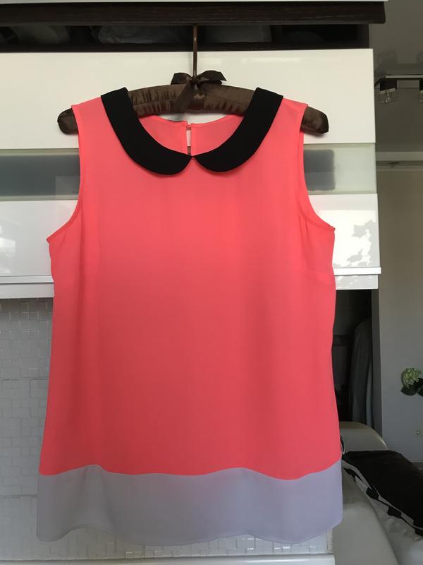 Блузка, красивая нарядная розовая неоновая блузка с черным воротничком и белым властным по низу, размер m. Будет красиво с белыми брюками или шортами, и с черной юбкой