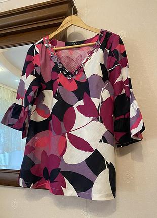 Блуза з натурального шовку, кольори чорний, білий, бордо. Покроєна по косій. По бокам має розрізи. Горловина мисиком, горловина спереду оздоблена декоративними елементами у вигляді кілець. Рукав вкорочений, по краю має оборку. Розмір 12. Заміри: НОГрудей 48 см По низу 53 см Довжина по спинці 62 см Рукав з оборкою 42 см Плече 7,5 см ( за рахунок вирізу горловини Стан дуже гарний. Етикетки нема, але річ нова, ще не була у пранні. Зауважую, що після прання льон може трохи сісти, вважайте на це, обираючи розмір