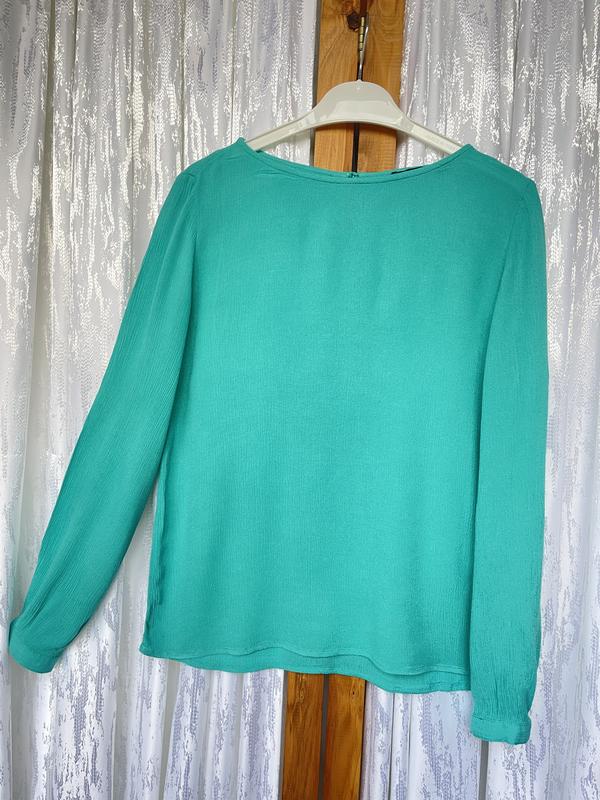 Блузка бирюзового цвета, размер 42/XS. Прямого кроя. Замеры: длина по спинке 52 см., длина рукава от плечевого шва 53 см., ширина между плечевыми швами 33 см., полу объем груди 43 см., полу ширина низа 43 см.