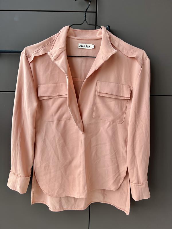 Стильна блуза з боковими розрізами, спереду вкорочена. Розмір ХС-С ( може бути на маленьку М). Вживу має персиковий колір 🍑. Має відкрите декольте, за бажанням можна пришити застібки. Гарно поєднується як з джинсами, так і з більш класичними брюками. Одялась один раз, тому стан, як новий. Заходьте також на мій профіль, для перегляду ще більшого асортименту 🌸