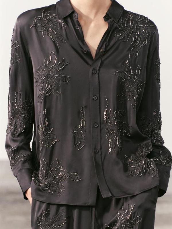 ZARA WOMAN COLLECTION Рубашка из 100% штапельной вискозы с вышивкой бисером, классическим воротником и длинными рукавами. Застегивается на пуговицы спереди.