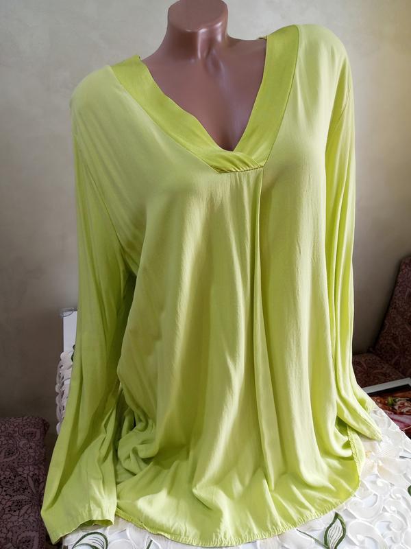 очень красивая салатовая ярка блуза качество натуральное коттон производитель Италия на длинный рукав а можно и подщепать делать как 3/4 спереди идет укороченная а сзади удлиненная красивый крой в ней вид стройный замеры: - пог до 65 - пот до 69 - поб до 71 - длина от плеча 82 впереди,92 зади состояние идеально Пишайте на мою страницу 😇