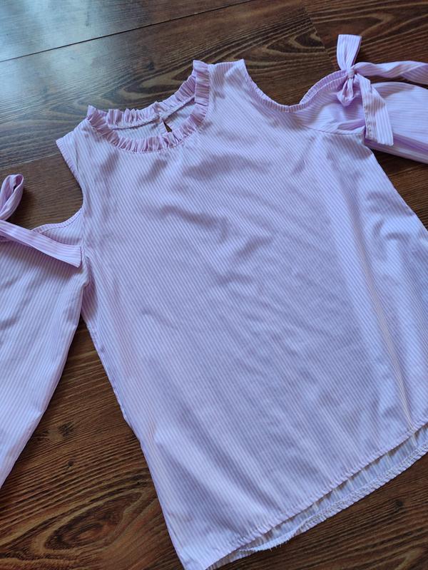 Блуза с открытыми плечами. На плечах бантики. Размер М. Нежного розового цвета.