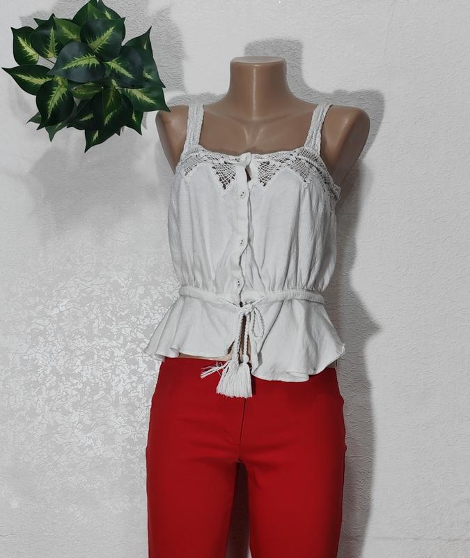 Нежная майка/блуза из воздушной ткани. Верх и бретели отделаны ажурным плетением. Пояс стягивается шнурочком.