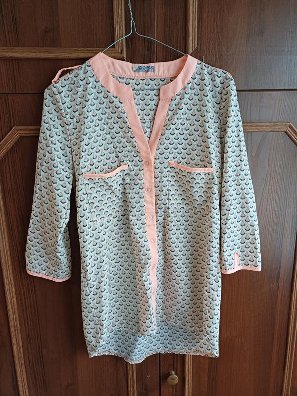Летняя рубашка. Перед короче, чем зад. Тканина тонкий софт. Рукав 3/4. Замер рубашки в груди 93-95. Длина впереди 65, а сзади 72.