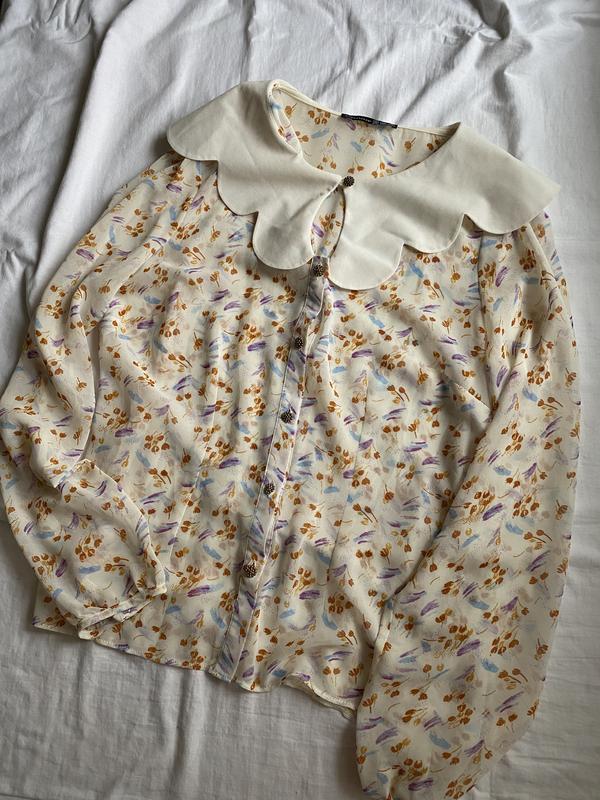 Невероятно красивая блуза в цветочный принт. Очень легкая. Полупрозрачная. Имеет невероятный воротничок. Замеры или дополнительные фото запрашивайте в уведомлении.