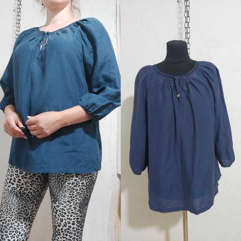 Легкая блуза Вверху на завязках Указан размер 42/10/32 В составе 65%-котон, 35%-шелк ПОГ-55 плечи-оверсайз рукав от шеи-55 ширина по нижн краю-56 длина изделия от плеча-63,5