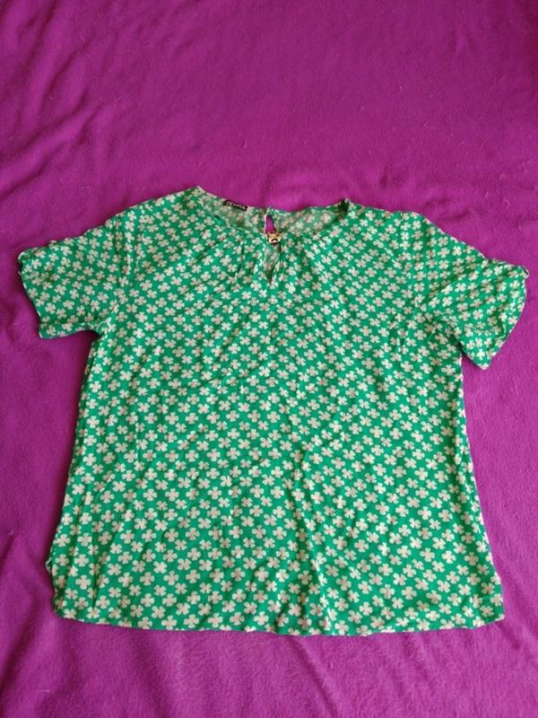 Легкая летняя блуза из материала типа штапель. Длина 64, грудь 55, талия 56. Рукавчик длина 31, ширина 19. На наш размер 50-54