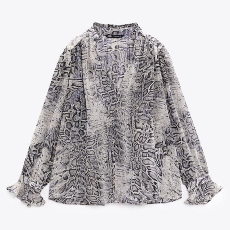 РУБАШКА С АНИМАЛИСТИЧЕСКИМ ПРИНТОМ Рубашка из полупрозрачной ткани с V-образным вырезом. Длинные рукава, воланы. Разноцветный | 8541/217 Женская серая блузка со змеиным принтом Zara, рубашка с длинным рукавом и v-образным вырезом, размер указан XL ориентируйтесь на дополнительные детали замеров: По плечам до 43см, по подмышкам до 75см, ПОГ до 73см, длина рукава от плеча 61см, длина изделия 63см/ воздушная, лёгкая, нежная, невесомая ткань MADE IN MOROCCO 🇲🇦 в составе ткани 💯 % полиэстер приятная к телу и тактильно ткань. Дополнительные детали замеров и фото спрашивайте. Отвечу всем. Состояние нового изделия без бумажной бирки 🏷 и замечаний. Полупрозрачная рубашка с V-образным вырезом и длинными рукавами. Гофрированная отделка