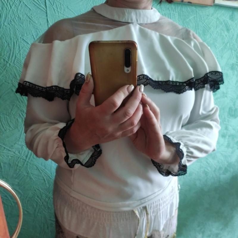 Белая блуза с длинным рукавом, украшенная черным кружевом, верх украшает белое кружево, ткань полиэстер. под руками 48 см высота 62 см