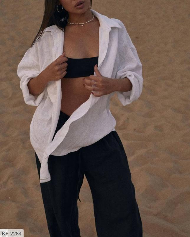 Рубашка KF-2284 Мод: 1071 Размеры: 42-44, 46-48 Хлопковая женская рубашка Присутствуют пати на рукавах, можно рукава подкатить и зафиксировать короткий рукав Жгучее предложение Ткань: лен Длина 65см Замеры: Первый размер ог-до 100см Второй размер ог-до 110см