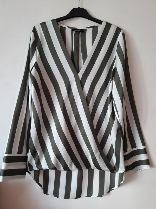 Блуза Wallis размер M-L, ткань с блеском, белая и темно оливковая полоса, имеется нюанс, показанный на последнем фото, поддерживается это поправим, пог 54см, длина спереди 61 см, сзади 75 см. Стильная вещь.