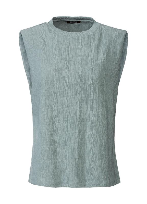 Блуза от Немецкого бренда Esmara. Чрезвычайно мягкий и качественный материал, имитирующий мятый вид. С круглым вырезом. Без рукавов, с модными накладками на плечах. Свободный крой. Замеры: предоставляем по запросу Состав: 98% полиэстер, 2% эластан (LYCRA®) Артикул: 400685 Возможно повреждение бирки.