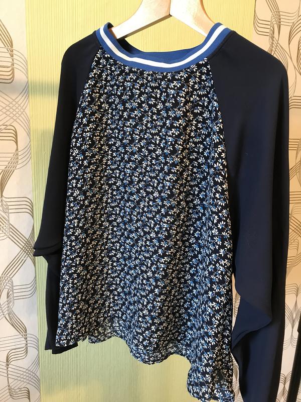 Очень интересная блузка в стиле оверсайз. Легкая ткань в цветочный принт, рукава темно-синие. Горловина под спортивный стиль. Отлично сочетается с джинсами. Ширина 56 см, длина рукава от горловины 62 см, длина изделия 50 см Больше блузок на моей странице