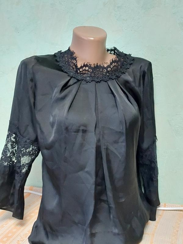 легкая блуза в идеальном состоянии, длина по спинке 57см, пог 46см, рукав ниже локтя, ширина плеч 35см состав полиестер размер указан М, маломерит