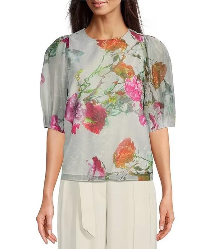 Женская блузка Ayymee от Ted Baker с цветочным узором для повседневного образа. Цвет: светло-серый тон, сплошной цветочный принт. Блузка имеет круглый вырез горловины, короткие объемные рукава и прямой подол. Застегивается на молнию сзади. Стандартный крой. Блузка имеет подкладку (100% полиэстер). Верхняя ткань органза, полупрозрачная, хорошо держит форму, создает ощущение воздушности, не тянется. Состав: 100% полиэстер. Состояние идеальное, новой вещи. Размер указан 2. Ориентируйтесь на замеры: Ширина плечи – 29 см ПОГ – 46 см Ширина внизу – 52 см Длина по середине спинки – 55 см Длина рукава – 38 см, длина плеча – 6 см.