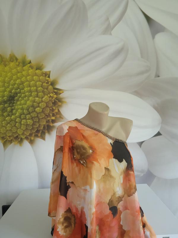Стильная блузочка с коротким рукавом и оригинальным цветочным рисунком. Легкая и комфортная. Приятная на ощупь. Шифон. Практически не тянется. Ложится свободно, красиво спадает. На одно плечо. Асимметричная по одной стороне значительно длиннее. Есть размеры.