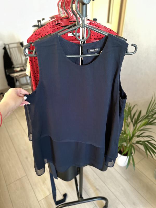 Блуза темно-синего цвета, украшена асимметричным ярусом ткани. Не просвечивается, имеет подкладку. Размер М. Orsay.