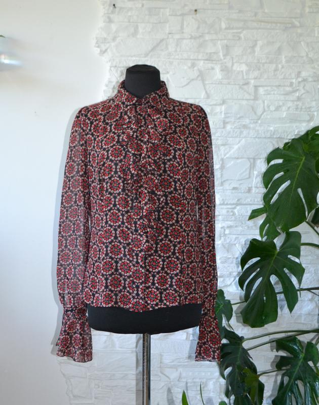 #блузка #блуза #шифоноваблузка #сорочка #квітвовий_принт #шифон Шифонова блузка в будь-яких її видах - це гімн жіночності❗ 🌸 Ніжність, легкість та елегантність відображається в цій моделі романтичної блузки в дрібненький квітковий принт 🌹 🌸 🌹 на чорному фоні з цікавим дизайнерським прийомом: зав"язкою комірця на трендовий бант 🎀 та звисаючим воланом -жабо cпереду та на рукавАХ від бренду LOLEEN X . SIZE: 16 вказано, але реально йде на M|L . На підкладці. Hезалежно від віку та особливостей фігури, така блузка підійде будь-якій жінці. ПАРАМЕТРИ ВИРОБУ, у спокійному лежачому стані: ПОГ - 52 см; ПОТ - 48 см; ПОС ( низ) - 58 см; Довжина рукава разом з воланом 75 см ( в т.ч. рукав - 64 см + манжет-волан - 11 см; Довжина виробу - 70 см.