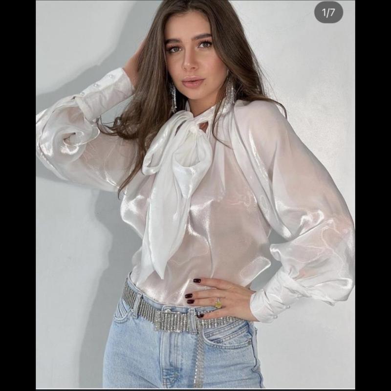 Блуза с бантом,ткань с переливом.Очень красиво смотрится.Замеры: Ог 53 см Длина 63 см Плечи 40 см Рукав 65 см
