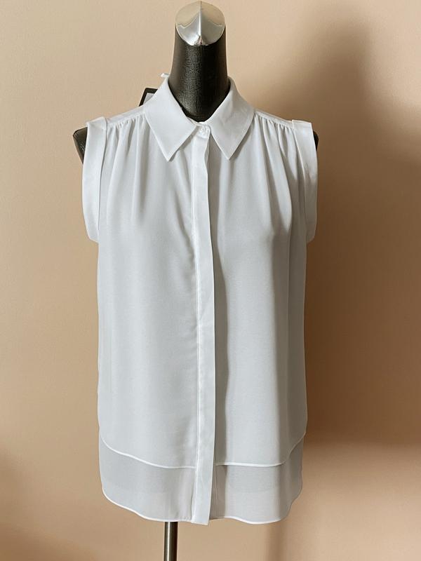 Классическая рубашка на лето- легкая, качественная. Цвет не чисто белый, молочный оттенок. Смотрится нарядно, но подойдет и на каждый день. Размер указан С, замеры: плечи 34см подмышки 53см длина 64см