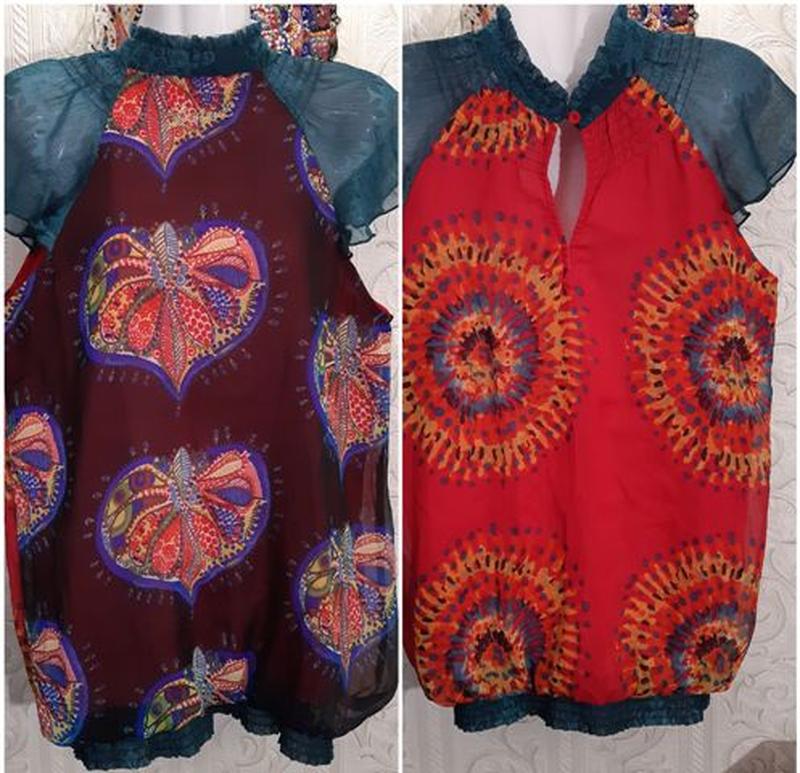 Перед и спинка разного цвета (см.фото). Длина-67, ширина-52, рукавчик (от воротника)-20. Бирка с сотавом срезана. Ткань похожа на шифон. Не тянется. Состояние, как новая. Никаких дефектов и следов носки. Воротник и низ собран на резинку. Подкладка из тончайшего хлопка.